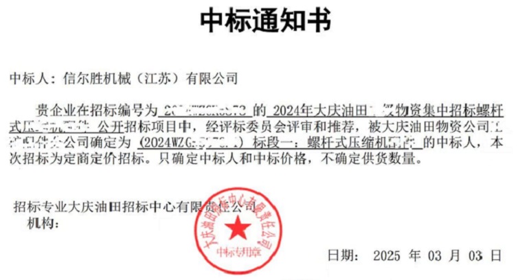 2025年3月6日,上海信然壓縮機江蘇工廠-信爾勝機械(江蘇)有限公司收到中國石油天然氣集團大慶油田【中標通知書】,信然集團作為空壓機、真空泵、鼓風(fēng)機、氫能源設(shè)備賽道的隱形冠軍,解碼信然中標總金額大于3200萬(叁仟貳佰萬)中石油訂單長周期競爭力!信然壓縮機制勝法寶:對標國際空壓機巨頭、從制造到“智造”、破局外資技術(shù)服務(wù)壟斷,解決卡脖子問題,實現(xiàn)國產(chǎn)替代和超越。