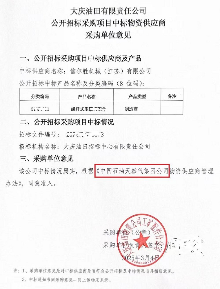 作為國內(nèi)壓縮空氣系統(tǒng)領(lǐng)域的領(lǐng)軍企業(yè)上海信然壓縮機有限公司(以下簡稱“信然空壓機”)今日宣布,信然空壓機江蘇工廠:信爾勝機械(江蘇)有限公司成功中標中國石油天然氣集團公司-大慶油田有限責(zé)任公司(以下簡稱“大慶油田”)大型空壓機設(shè)備配件采購及技術(shù)服務(wù)項目總金額大于3200萬(叁仟貳佰萬)元訂單。此次合作標志著信然空壓機在能源裝備領(lǐng)域的技術(shù)實力與市場競爭力再獲國家級的認可,同時也為國內(nèi)油氣田行業(yè)綠色低碳轉(zhuǎn)型注入新動能。