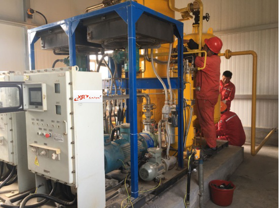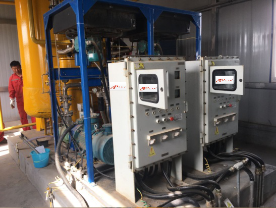 1)流量適應(yīng)寬度廣:油罐在日光強(qiáng)烈時(shí)段的高峰揮發(fā)氣量可達(dá)到晚間低氣量的1.5倍左右。且罐內(nèi)含水、油溫度較高,揮發(fā)氣中除了來自分離器的伴生氣之外,還有部分水蒸汽,約為伴生氣量的20%(受溫度變化),綜合以上因素,確定油罐揮發(fā)氣量(含水蒸汽)約為液量的1倍~2倍,系統(tǒng)必須適應(yīng)較大和較小氣量兩種極端工況,設(shè)計(jì)壓力可高達(dá)1500Pa,變頻運(yùn)行維持壓力500Pa,可操作壓300-1200Pa。2)設(shè)備特點(diǎn):油罐至大罐抽氣裝置的運(yùn)行壓力很低,只有實(shí)現(xiàn)運(yùn)行參數(shù)的控制,方可確保油罐的密閉運(yùn)行,因此采用雙螺桿式增壓機(jī),優(yōu)點(diǎn)是具有較強(qiáng)的適應(yīng)能力、良好的運(yùn)行性能及精準(zhǔn)的控制水平,與活塞式相比,具有運(yùn)行無脈沖,可帶液運(yùn)行,排氣溫度低,故障率低,使用壽命長,維護(hù)方便,系統(tǒng)多級(jí)保護(hù),安全穩(wěn)定。3)系統(tǒng)的安全運(yùn)行方式:罐壁腐蝕形成的氧化鐵會(huì)與揮發(fā)氣中的硫化氫反應(yīng)生成硫化亞鐵,由于著火點(diǎn)很低(約為50℃),一旦與氧接觸極易引起自燃,因此需嚴(yán)控空氣進(jìn)入罐內(nèi)。當(dāng)壓力降至300Pa(g),啟動(dòng)低報(bào)警,并聯(lián)鎖自動(dòng)回氣閥開啟;壓力繼續(xù)降低至200Pa(g)時(shí),啟動(dòng)低低報(bào)警,停運(yùn)壓縮機(jī),補(bǔ)氣閥打開。壓力繼續(xù)下降至150-100Pa,提醒操作人員及時(shí)打開應(yīng)急手動(dòng)補(bǔ)氣閥。自動(dòng)檢測氧氣含量,超標(biāo)報(bào)警停機(jī),系統(tǒng)可切入油田自動(dòng)化管理系統(tǒng),手機(jī)APP,實(shí)時(shí)監(jiān)控。4)撬裝化設(shè)計(jì):設(shè)備采用撬裝化設(shè)計(jì),運(yùn)輸方便、安裝快捷、省時(shí)省力。5)售后服務(wù)及時(shí):設(shè)備在上海、江蘇地區(qū)加工制造,如果出現(xiàn)問題短時(shí)間內(nèi)到達(dá)使用現(xiàn)場。