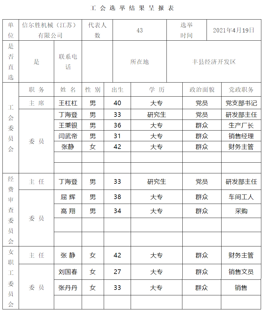 一是我們向開發(fā)區(qū)總工會遞交了成立工會組織的申請報告,開發(fā)區(qū)總工會同意我單位成立工會委員會,并要求我們召開工會成立大會,民主選舉工會三個委員會。二是成立了由5人組成的籌建工會領導小組,積極對接工會籌備工作。三是按照《中國工會章程》的有關規(guī)定,公司遵循員工自愿入會的原則,在廣泛宣傳的基礎上,認真做好發(fā)展職工加入工會組織工作,公司現(xiàn)有103名職工已加入工會組織,入會率已達100%。四是經(jīng)過民主推薦和協(xié)商確定了工會委員會、經(jīng)費審查委員會和女職工委員會委員候選人。五是認真做好大會各項籌備工作,現(xiàn)在大會各項工作準備就緒,可以召開信爾勝機械(江蘇)有限公司工會成立大會。