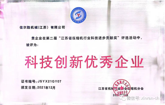 祝賀信然壓縮機(jī)徐州工廠— 信爾勝機(jī)械(江蘇)有限公司榮獲“科技創(chuàng)新優(yōu)秀企業(yè)”稱號(hào)!
